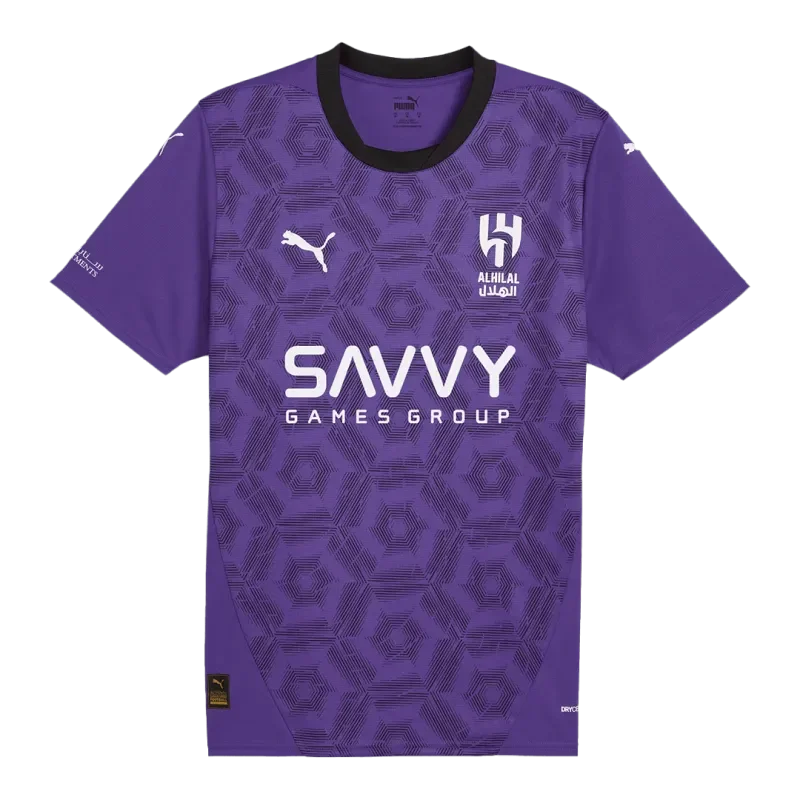 Details of the jersey: Description about the Al Hilal SFC Third Away Soccer jersey: Al Hilal SFC Third Away Jersey 2024/25 OUT NOW! The Al Hilal SFC replica football jerseys are for the Saudi Professional League next season. And the Al Hilal SFC jersey will be worn by the likes of Neymar, João Cancelo, Rúben Neves, Sergej Milinković-Savić, Kalidou Koulibaly and Renan Lodi. The Al Hilal SFCreplica football jersey aredominated by the colour purple and incorporates a design with a hexagonal pattern and thin border on the front. White detailing has also been added throughout the black Al Hilal SFC jersey, applied to the text and sponsor logo and team badge. Additionally, the only black colour is applied to the round collar of this Al Hilal SFC jersey. 2024/25 Al Hilal SFC jersey features a unique sublimated pattern on the front, adding depth and visual interest to the design.