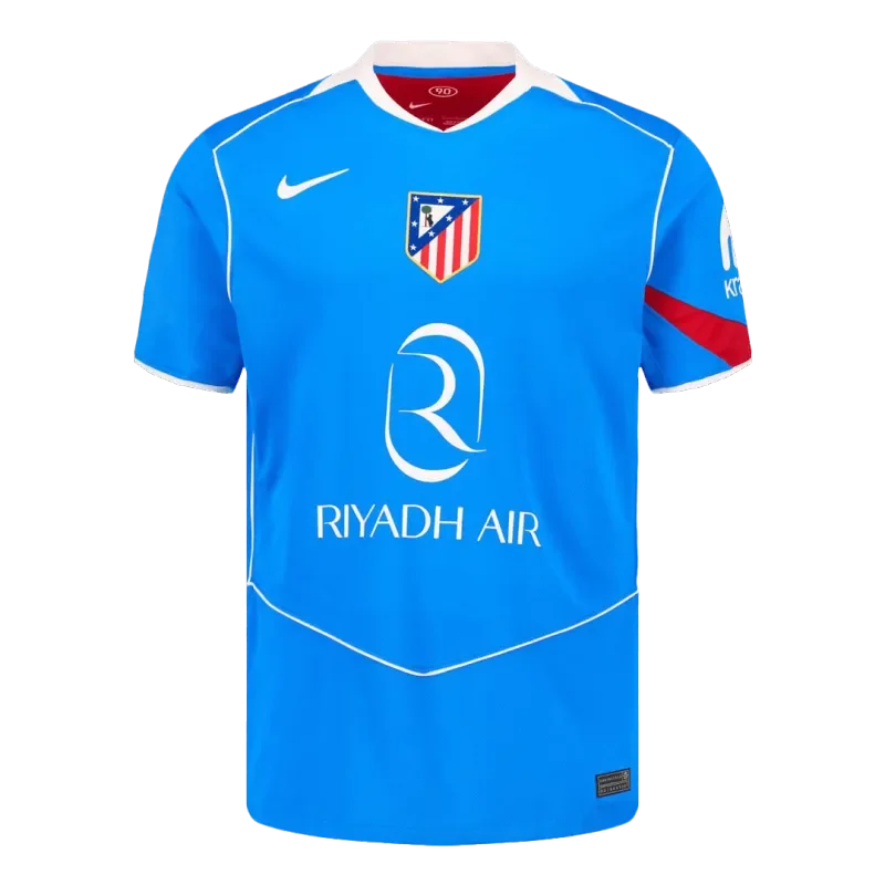 Zapafootball proudly presents theAtletico Madrid Third Away Soccer Jersey 2025/26, a stunning tribute to the legendary T90 era. ThisAtletico Madrid jerseyshowcases a modern twist on nostalgia, combiningPhoto Blue,Sport Red, andWhite— a color scheme that echoes the beloved 21/22 season. Designed using Nike’sTotal 90 2025 template, thisAtletico Madrid football jerseyblends heritage and innovation for fans who live and breathe the red and white spirit.