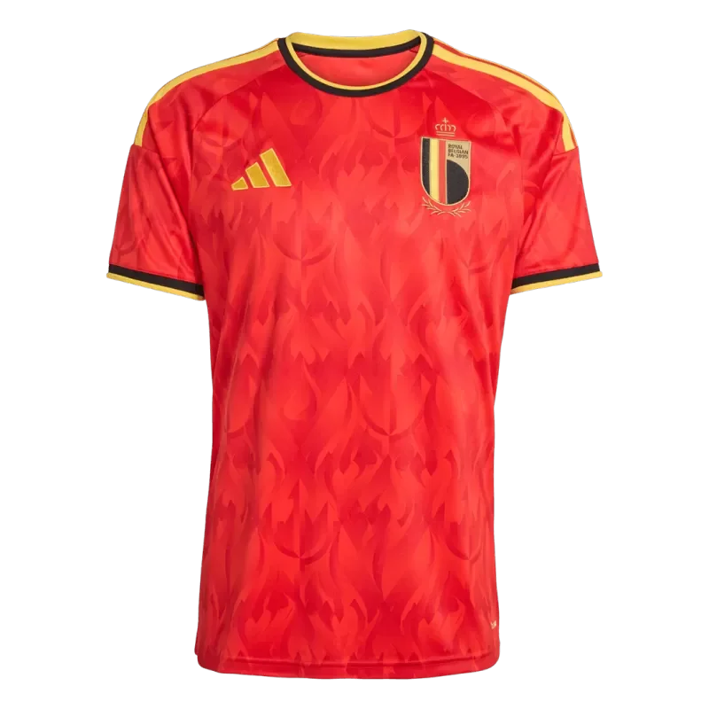 TheBelgium Home Soccer Jersey World Cup 2026captures the heart of the Red Devils’ identity. Featuring adeep red basewithgold and black detailing, thisBelgium jerseysymbolizes courage and determination. The standout design mergestulip shapes with flames, forming a fiery devil motif that celebrates Belgium’s bold football spirit.