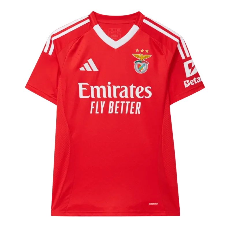 Description about the Benfica jersey: The cheap Benfica team’s kit for the 2024-2025 season showcases a striking design featuring a pattern in varying shades of red with V-stripes. The Benfica jersey includes the logo intricately on the right side of the chest, while the SL Benfica emblem, boasting three stars representing the club’s ten championship victories, adorns the left side. This Benfica jersey is further distinguished by the presence of the three iconic stripes on the sleeves, along with mesh panels in white strategically placed on the armpits, sides, and lower back. Designed with Climalite fabric and innovative Aeroeady technology, the Benfica jersey effectively wicks away sweat, ensuring the skin remains dry and comfortable throughout the game.