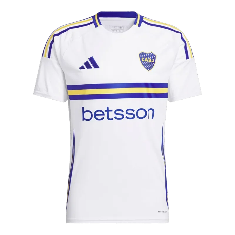 Details of the jersey: Description about the Boca Juniors jersey: Boca Juniors Away Soccer Jersey 2024/25 OUT NOW! Boca Juniors jersey is designed with white as main color, then complementing with blue and yellow colours. The Boca Juniors jersey 24/25 is inspired by long “tirantes” banners that run down La Bombonera’s stands, which has a huge meannig to Boca Juniors football club. We can see the “XENEIZE” (“GENOESE”) nickname is added on the upper back – are in blue. Blue and yellow accents are designed in the centre, on the shoulders, collar and side panels of Boca Juniors camisetas futbol. It’s time to show your support for the iconic football club with this stylish and high-quality Boca Juniors jersey.The whole Boca Juniors kit is completed with matching white shorts and socks.
