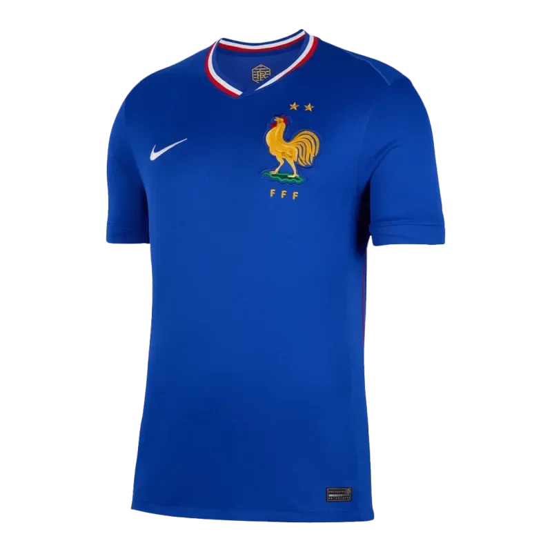 Description about the France jersey: The new blue France jersey home perfectly showcases French elegance and style. The FFF 2024 EURO home France jersey is inspired by classic jerseys from the 1960s, celebrating the country’s vibrant and diverse culture. The oversized rooster and tricolor French flag ribbing, made of embroidery on the chest, symbolize French pride. The sides of the France home soccer jersey EURO 2024 added red mesh panels showing special point.