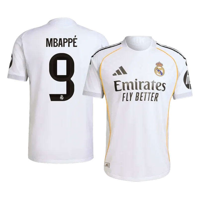 The jersey features a classic white base with yellow piping, light gray applications, and black logos, symbolizing Real Madrid’s history and ambition. The yellow line running down the sides of the kit mirrors Mbappé’s fast-paced, attacking nature, while the subtle gray striping on the cuffs and collar completes the look. Whether you’re watching from the stands or wearing it in the street, this Real Madrid football jersey perfectly embodies the energy and style of one of football’s biggest names.Custom #9Mbappé Jersey: Get the Authentic jersey with Mbappé’s iconic number 9 and show your support for one of the world’s top footballers.