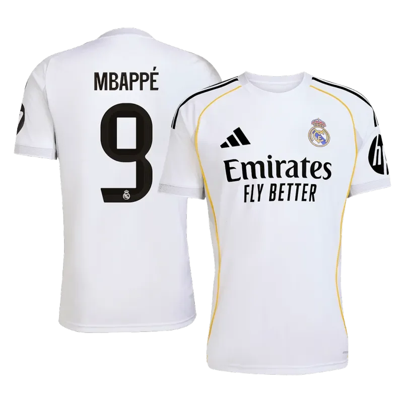The jersey features a classic white base with yellow piping, light gray applications, and black logos, symbolizing Real Madrid’s history and ambition. The yellow line running down the sides of the kit mirrors Mbappé’s fast-paced, attacking nature, while the subtle gray striping on the cuffs and collar completes the look. Whether you’re watching from the stands or wearing it in the street, this Real Madrid football jersey perfectly embodies the energy and style of one of football’s biggest names.Custom #9Mbappé Jersey: Get the soccer jersey with Mbappé’s iconic number 9 and show your support for one of the world’s top footballers.