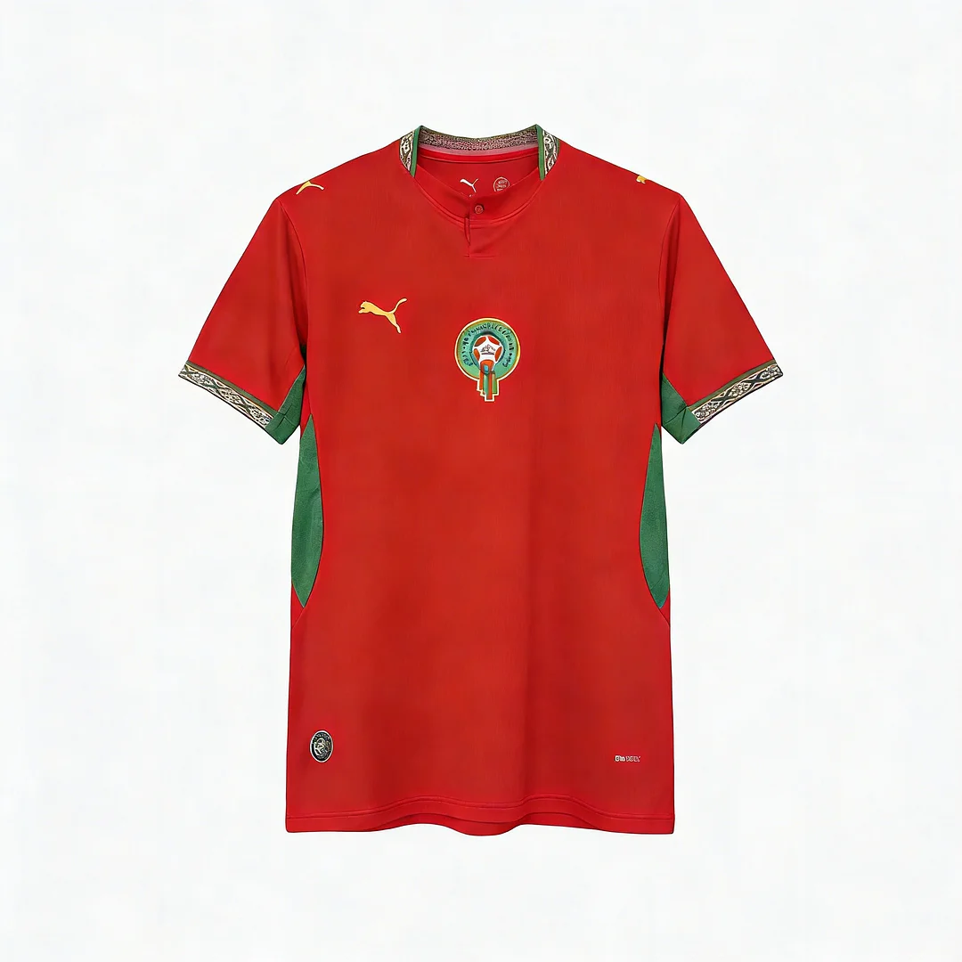 Details of the jersey: Description about the Morocco jersey: The Morocco jersey is a masterful fusion of the classic Morocco red and vibrant green accents, creating an iconic design that has garnered admiration over the years. The green tones are thoughtfully integrated into the collar, cuffs, sides, and back, resulting in a cohesive and stylish aesthetic on this Morocco jersey. Furthermore, this remarkable Morocco jersey is embellished with graphics inspired by the celestial motifs found on the Moroccan flag, this striking stars are elegantly positioned on its front. When players wear this Morocco  jersey on, they simultaneously embody their nation’s pride. This Morocco jersey has become emblematic of sporting excellence in the realm of football. This 2024/25 Morocco camiseta futbol holds profound significance as preparations unfold to host both men’s and women’s Africa Cup of Nations tournaments in 2025.