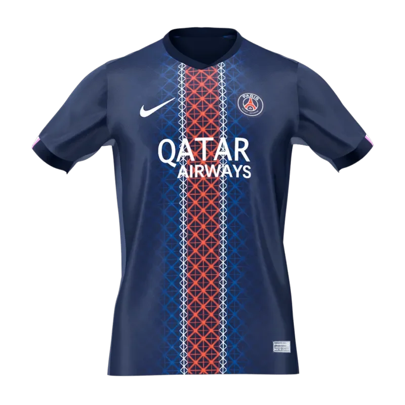 Color: Midnight Navy with red & white Hechter stripeDesign Highlights: Geometric architectural print, tribute to the Eiffel TowerCollar: Overlapping V-neck style (as seen on Inter 24-25 kits)Inner Collar Graphic: “Ici c’est Paris” – a rallying cry for every PSG fanSleeve Cuffs: Featuring the French flagSponsor Integration: Bold Qatar Airways logo with no surrounding white spaceChoose fromPSG authentic jersey, fan jersey, or replica jersey versions to suit your style and budget.