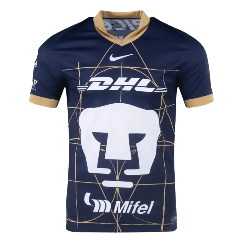 Description about the Pumas UNAM jersey: Drawing inspiration from their Pumas UNAM jersey from the late 90s and the club’s unique crest for the away respectively, thenew Pumas UNAM jersey24-25 away football shirt still has the main navy color with a large white Pumas crest on the front of Pumas UNAM jersey. The collar and cuffs are both gold, giving a classic feel. The inspiration behind this design is the origin of the Puma head logo itself; it sits upon a geometric pattern in gold, nodding to the fact the crest recently celebrated its 50th anniversary by acknowledging the original sketches of its preconception.