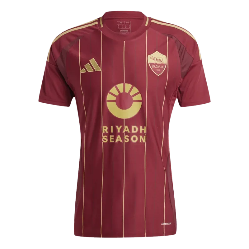 Description about the Roma jersey: Thenew Roma Home jersey 2024follows adarker shade of red and the burgundyscheme with gold featuring prominently, making the Roma jersey looks clean and classy. The design of Roma’s new home jersey in a combination of red and gold colours was inspired by early season tickets from 1933 and 1934. The red Roma jersey is covered with thin gold stripes, creating an intricate contrast and giving the Roma jersey a clean and elegant style. The detailed‘A.S.’features the word‘Roma’on the back of the collar, emphasizing the team’s identity.