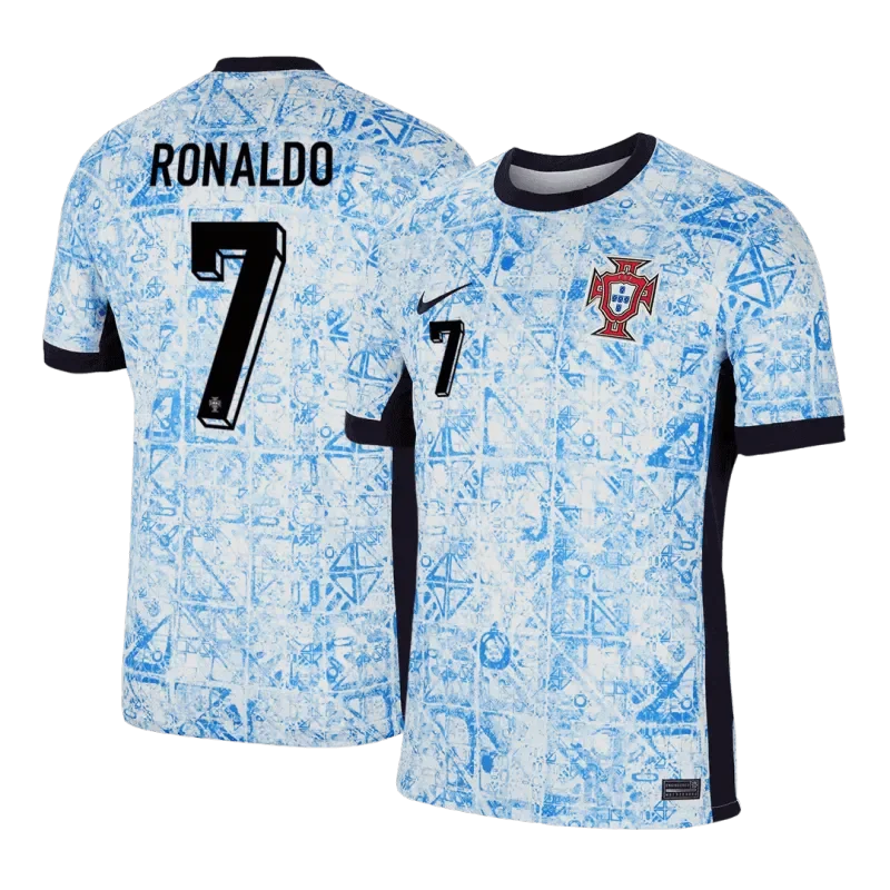 Description about the Portugal jersey: This new Portugal away jersey soccer EURO 2024 is inspired by the country’s traditional architectural art with embroidered black brand logo and red brick team logo, giving players and fans more pride and desire to win when playing away games. 2024 2025 EURO Portugal jersey away features the typical design of traditional blue tiles, adding a subtle hue to the usual white of Portugal jersey.